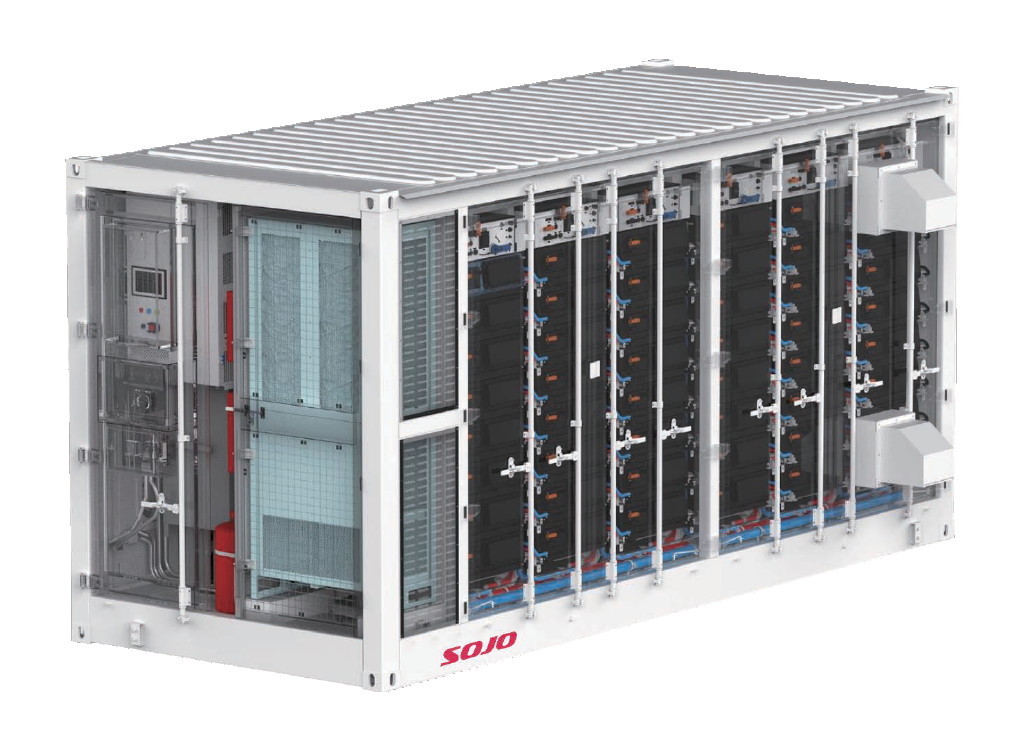 標(biāo)準(zhǔn)化集裝箱設(shè)計(jì)(20尺),非步入式維護(hù),液冷散熱、高能量密度、采用9簇電池并聯(lián)接入PCS